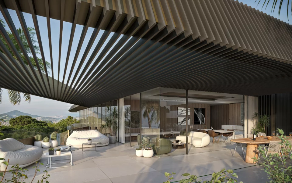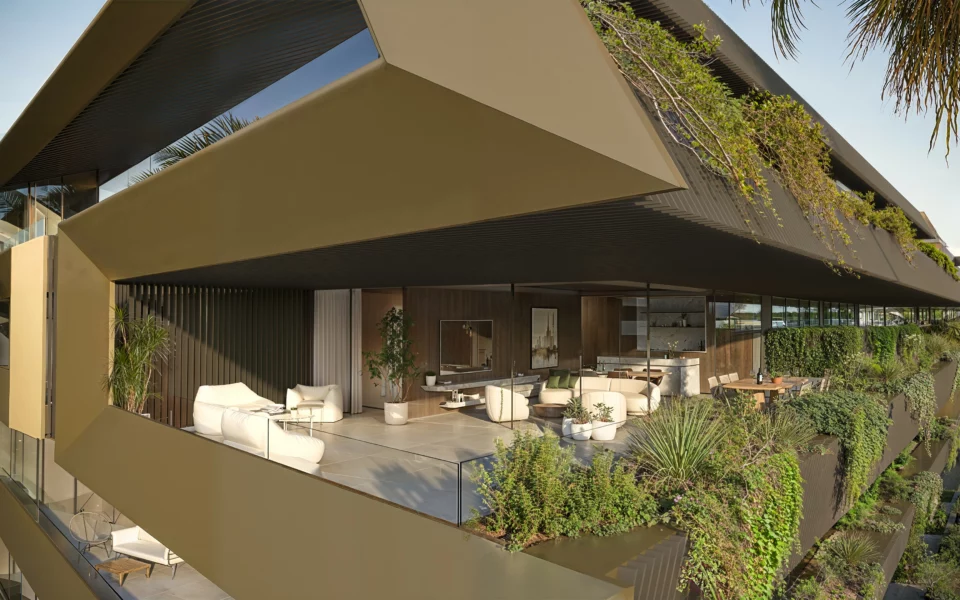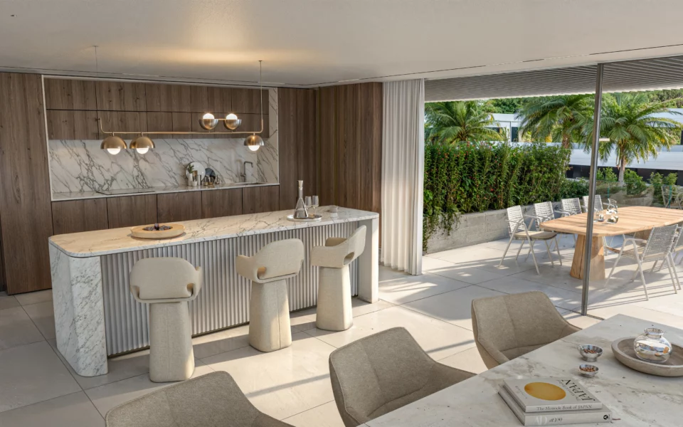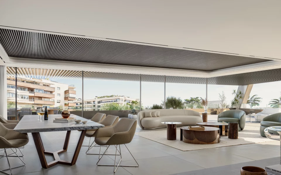 Residences range from 2 to 3 bedrooms, all designed with generous proportions and bright, open-plan living spaces. Ground-floor apartments include private gardens and individual pools, while penthouses feature expansive rooftop terraces with solariums and private pools. Mid-floor units offer large terraces, with some properties including their own pool.