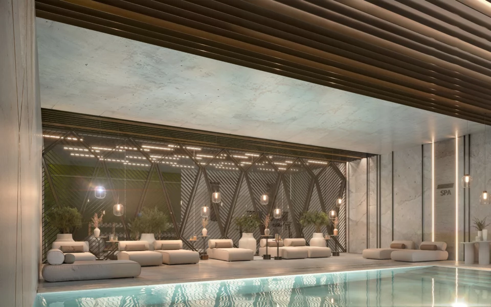 Every home comes with two underground parking spaces, a private storage room, and high-end specifications including aerothermal climate control, premium kitchen appliances, and double-glazed windows. Residents benefit from a full range of lifestyle amenities: a spa with sauna, fully equipped gym, social club and coworking space, alongside landscaped communal gardens and a swimming pool.